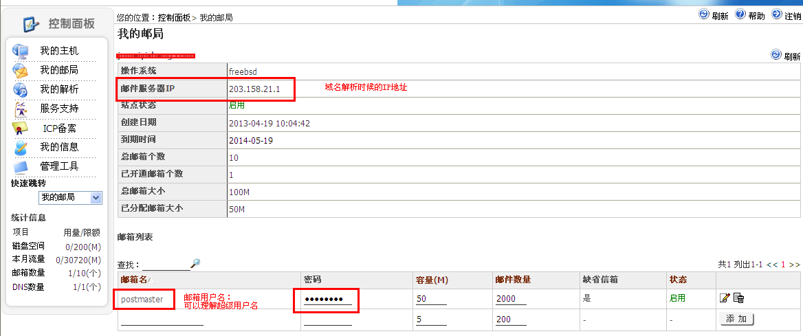 1.郵箱的詳情敬請參照各自的空間,進入空間控制面板可以看到對應的郵局